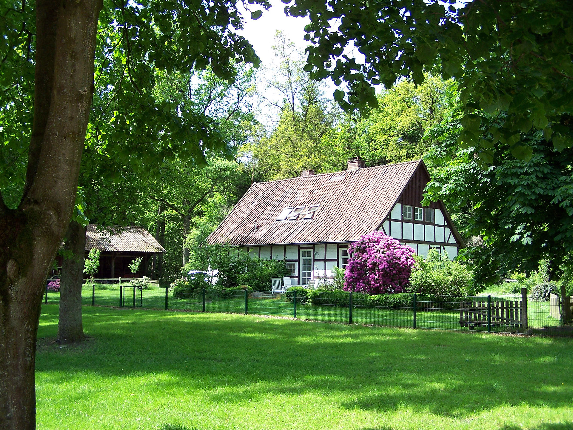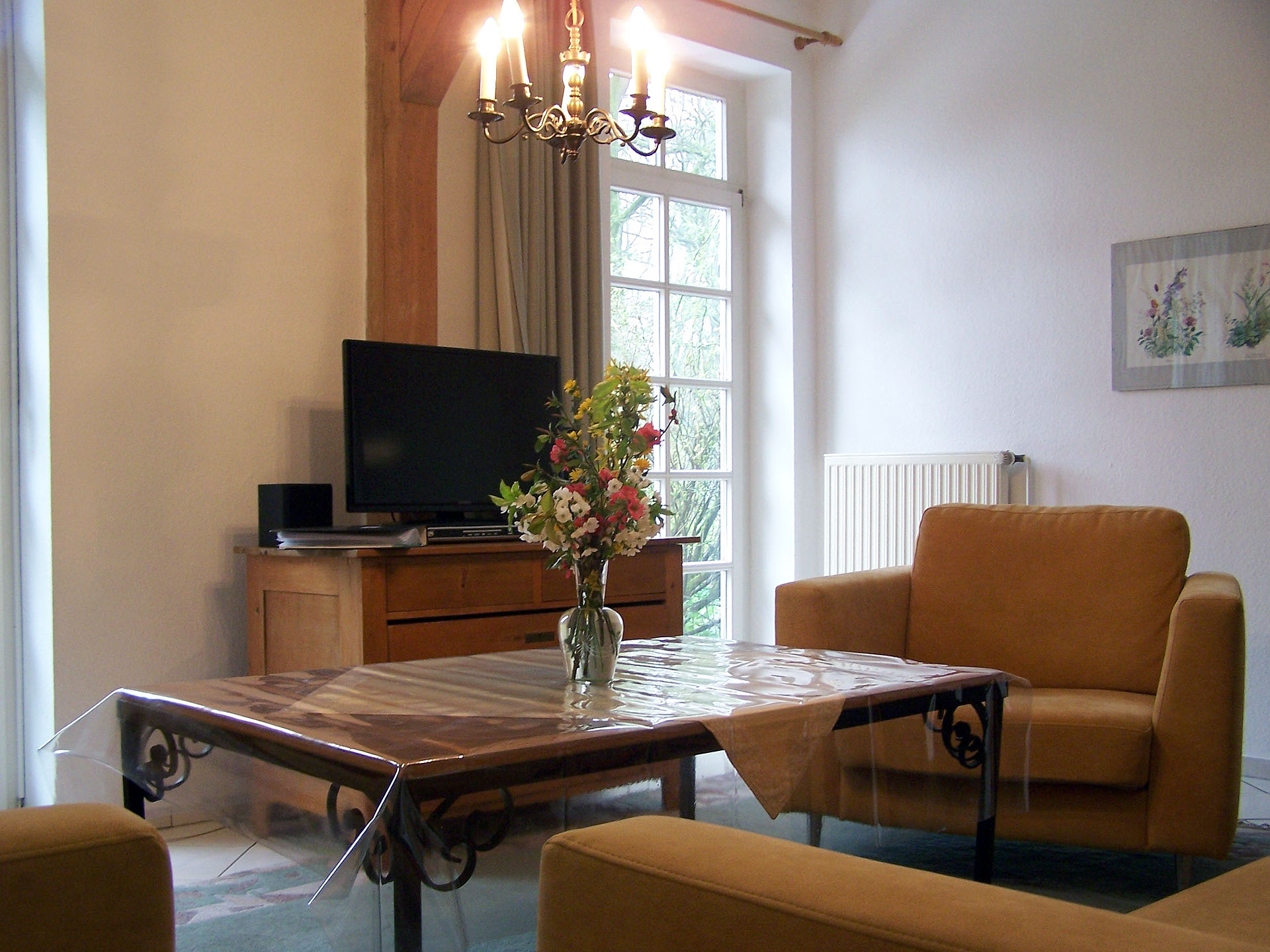 Der Blick von Wohnzimmer und Terrasse geht auf das Hofgelände mit Wiesen und altem Baumbestand.