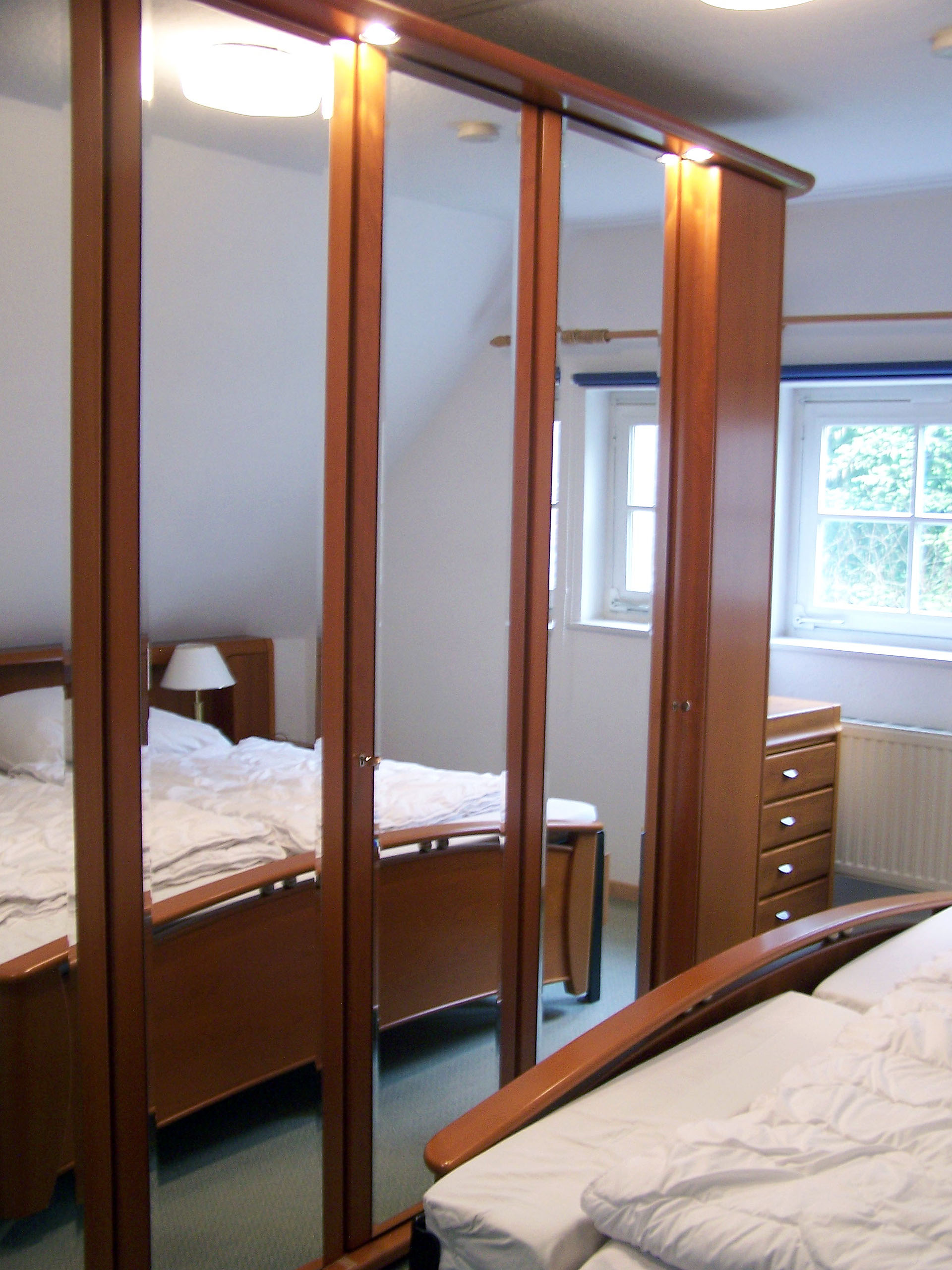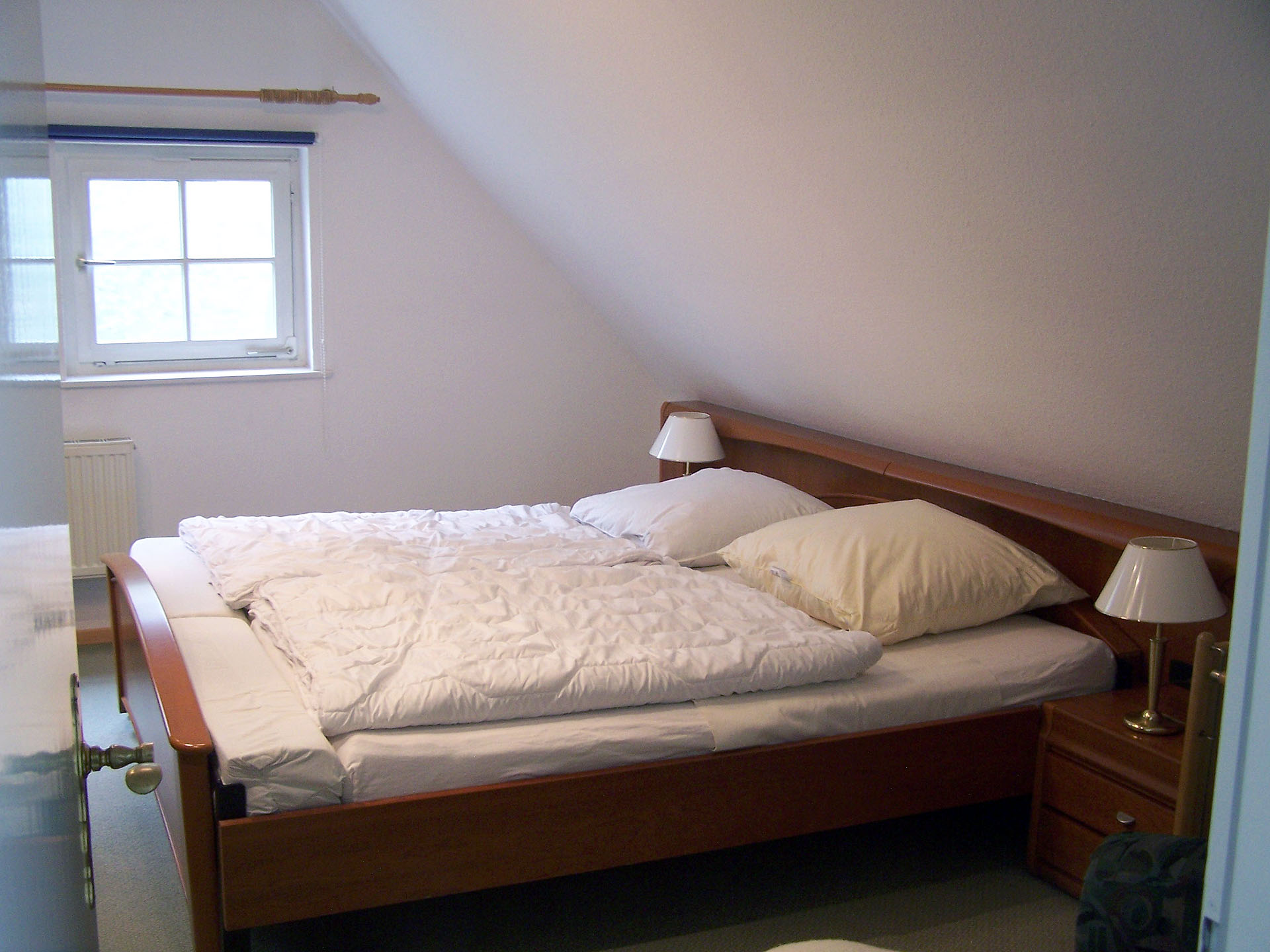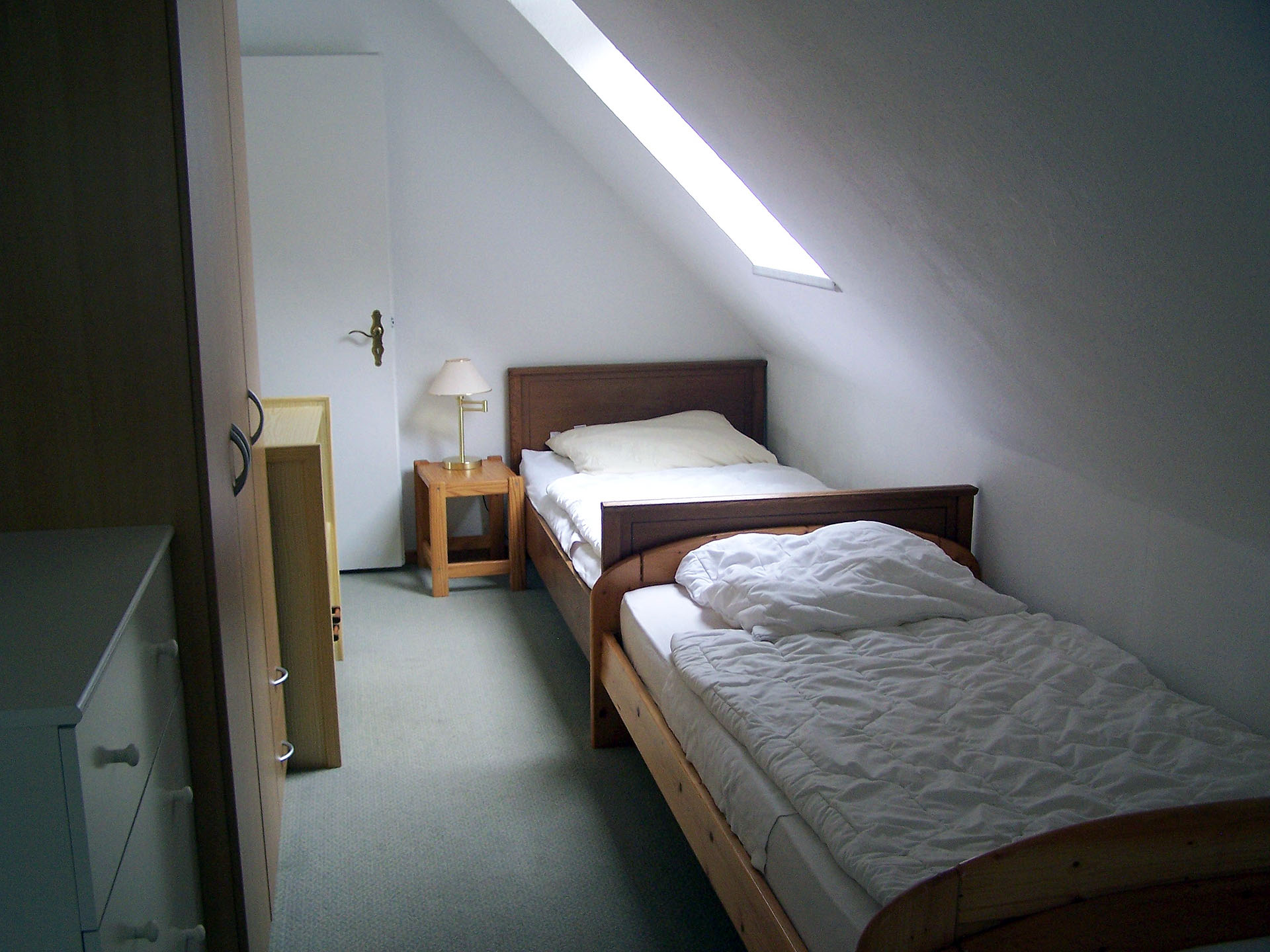 Im Obergeschoss befinden sich ein weiteres WC und zwei Schlafräume, die Platz für 5 Personen und ein Kleinkind bieten. Der Zugang zur Treppe kann mit Holzgittern gesichert werden.
