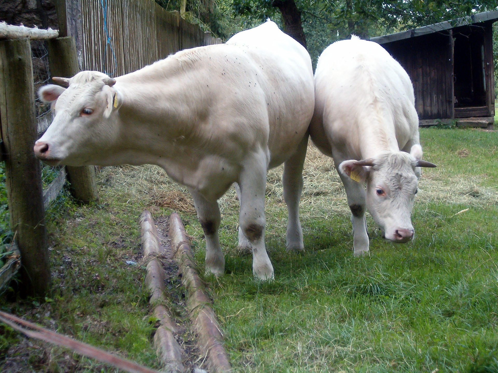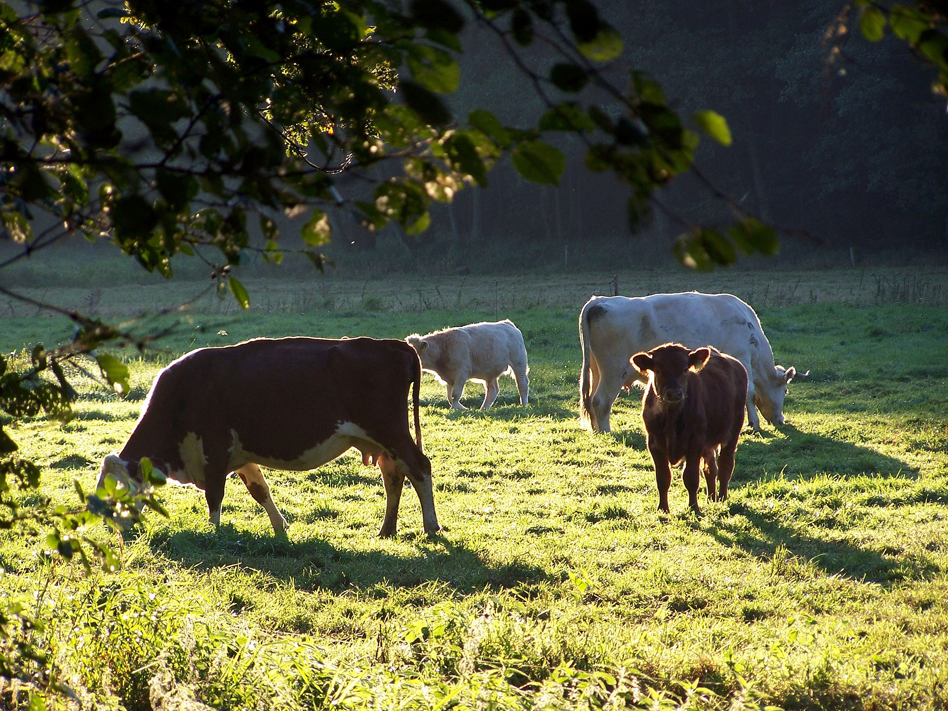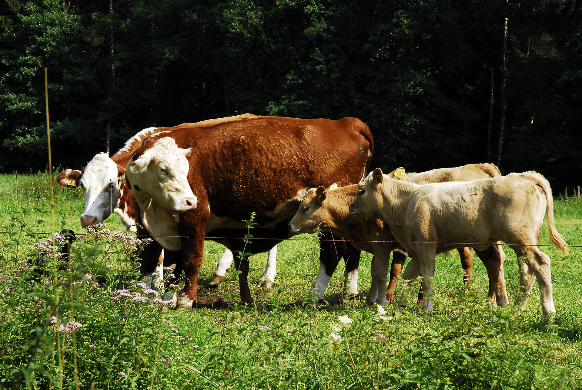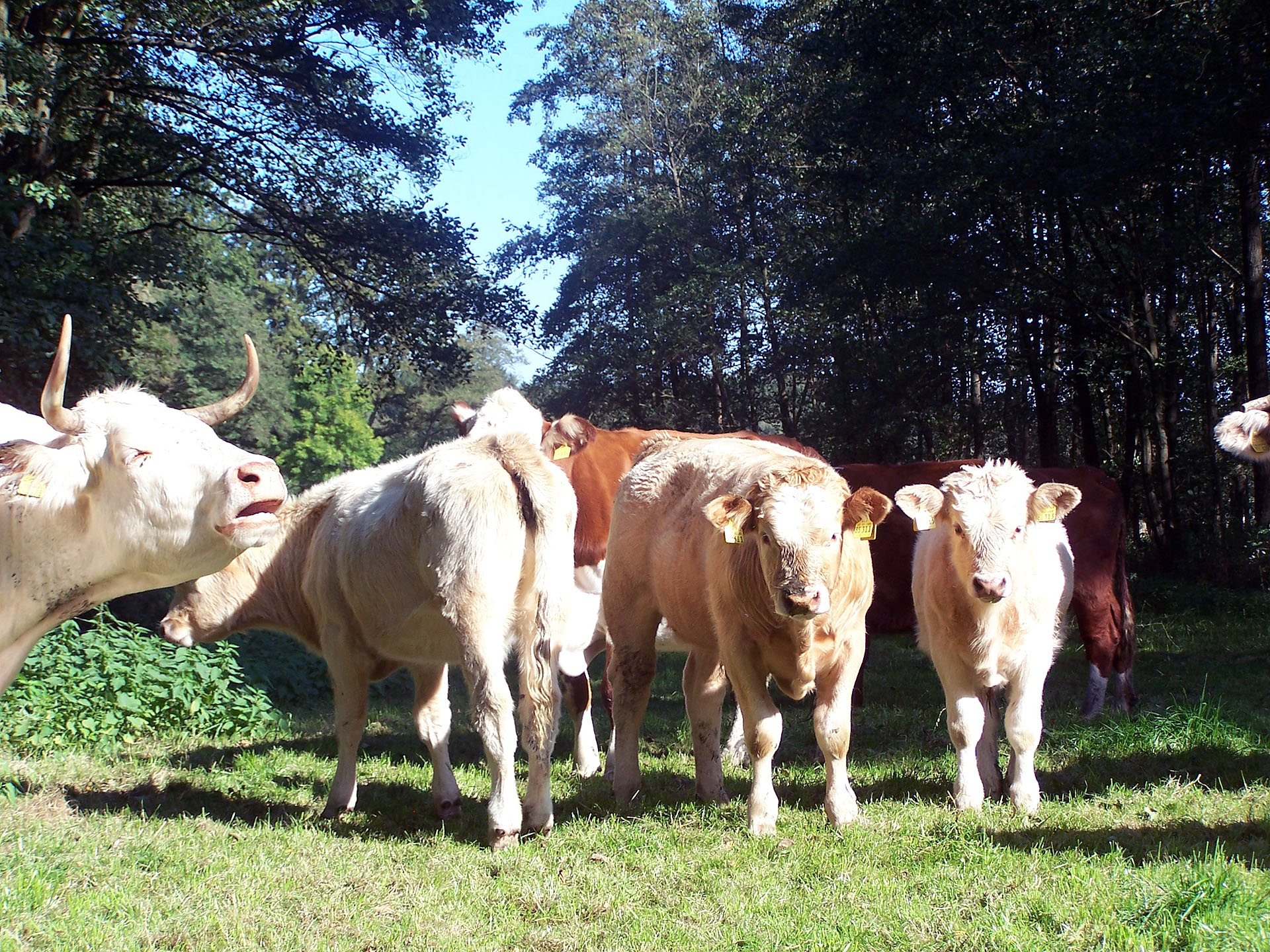 Wir haben eine kleine Mutterkuhherde mit ihren Kälbern (insgesamt je nach Jahreszeit 6-11 Tiere). Den Sommer verbringen sie auf den saftigen Lehrdewiesen. Wenn die Herde von Zeit zu Zeit auf eine neue Wiese getrieben wird, unterstützen uns unsere Gäste meist tatkräftig. Über Winter wird die kleine Herde im Laufstall mit ständigem Zugang zu Futter aufgestallt. Sobald alle Kälber geboren sind, meist Anfang Juni, darf die Herde wieder auf die Weide. Im Sommer läuft für ca. 2 Monate ein Bulle mit. Heu und Silage für unsere Tiere bringen wir selbst ein.