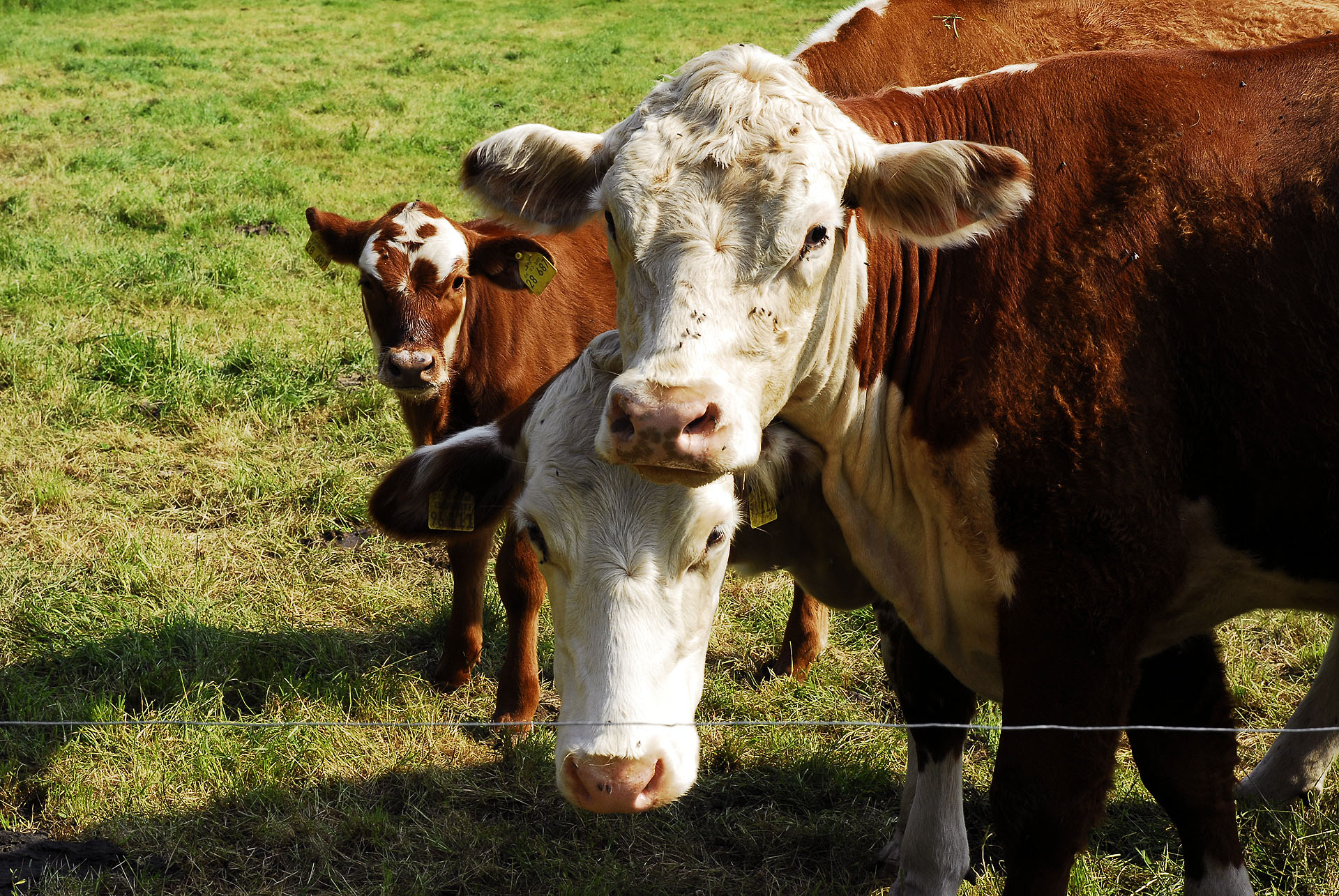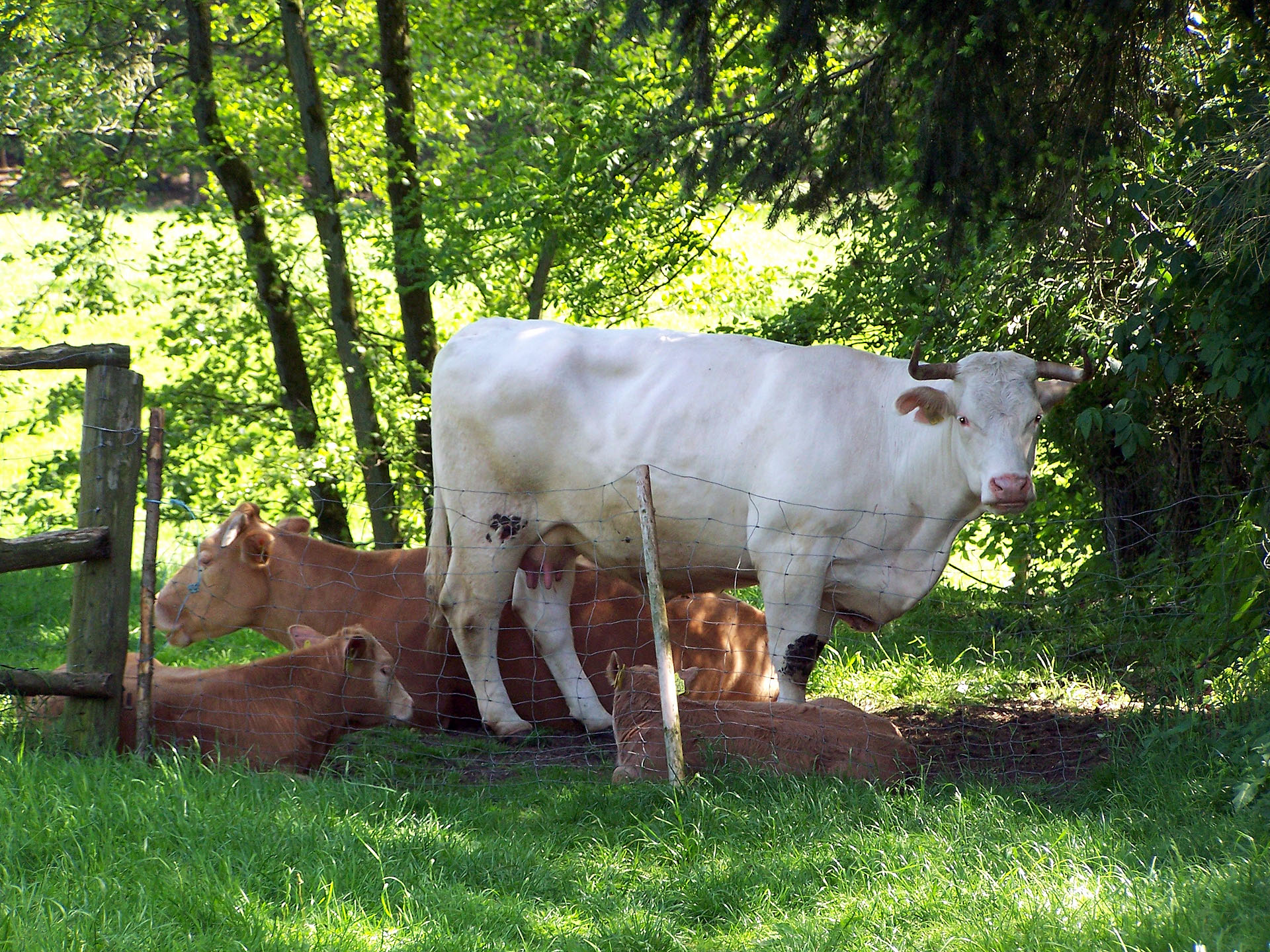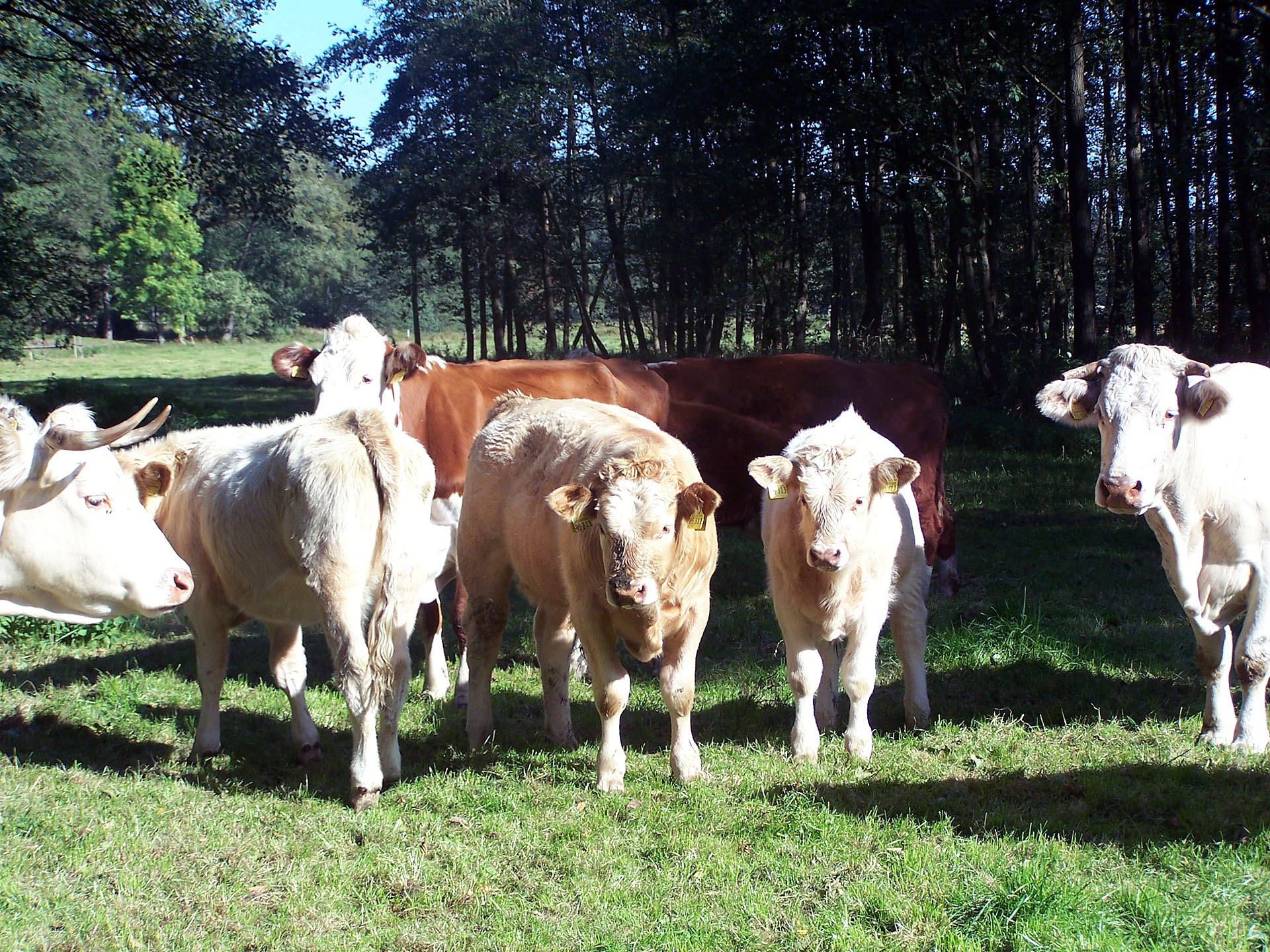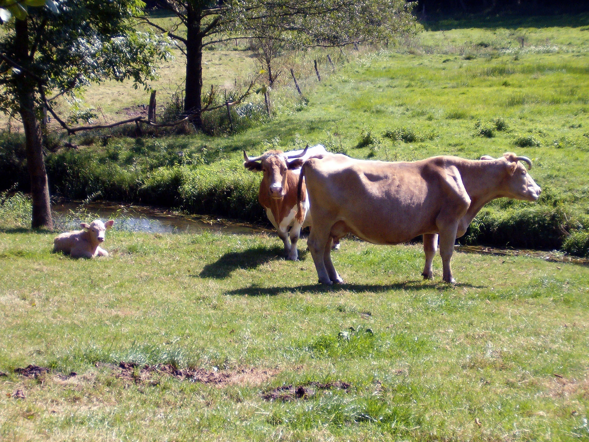 Wir haben eine kleine Mutterkuhherde mit ihren Kälbern (insgesamt je nach Jahreszeit 6-11 Tiere). Den Sommer verbringen sie auf den saftigen Lehrdewiesen. Wenn die Herde von Zeit zu Zeit auf eine neue Wiese getrieben wird, unterstützen uns unsere Gäste meist tatkräftig. Über Winter wird die kleine Herde im Laufstall mit ständigem Zugang zu Futter aufgestallt. Sobald alle Kälber geboren sind, meist Anfang Juni, darf die Herde wieder auf die Weide. Im Sommer läuft für ca. 2 Monate ein Bulle mit. Heu und Silage für unsere Tiere bringen wir selbst ein.