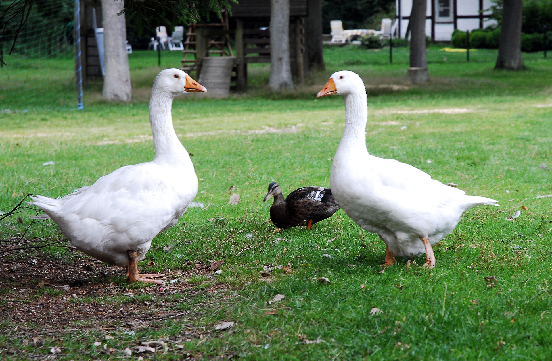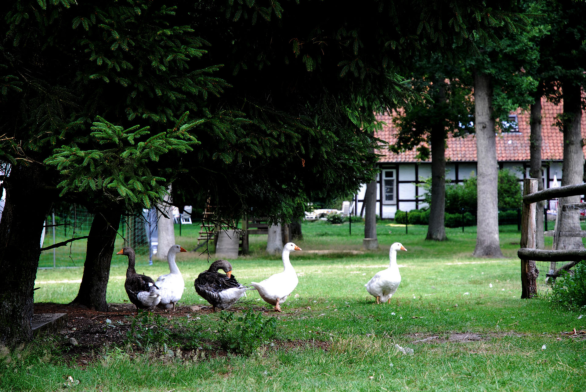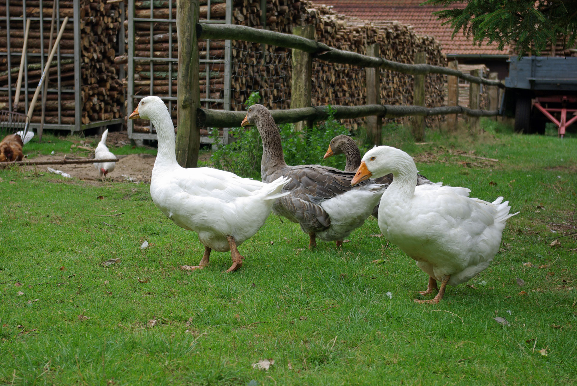 Zurzeit bevölkern 5 Gänse und mehrere Hühner mit Hahn unseren Hof. Auch sie dürfen sich nach Herzenslust frei bewegen. Wie wäre es mit einem frischen Frühstücksei von wirklich glücklichen Hühnern?